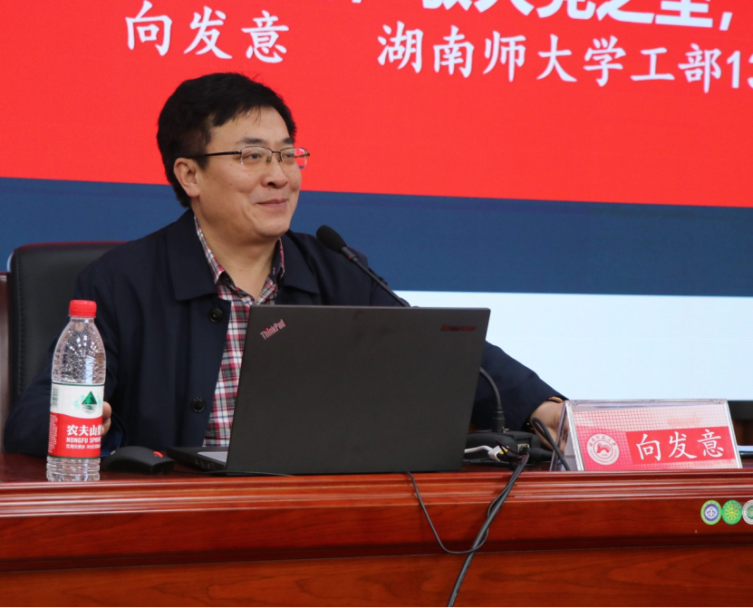 向发意以《读主席诗词,敬大党之坚,悟进取之志》为题,指出毛泽东诗词既富有家国情怀,又蕴含历史文化。他用三句诗串起百年党史的三朵浪花,讲述中国共产党成立百年来三个重要阶段,“雄关漫道真如铁,而今迈步从头越” 代表中国共产党成立;“天若有情天亦老,人间正道是沧桑”代表南京解放;“一唱雄鸡天下白” 代表中华人民共和国成立。新时代青年以“世上无难事,只要肯攀登”的精神和“敢教日月换新天”的气魄,实现了毛主席“可上九天揽月,可下五洋捉鳖”和“一桥飞架南北,天堑变通途”的宏愿。“长风破浪会有时”,中国梦是星星之火可以燎原的希望,也是世界太平和人民安居乐业的愿景,更是绘制敢教日月换新天的蓝图。湖南是一方红色热土,大批共产党人在这片热土谱写了感天动地的英雄壮歌,他希望,同学们能继续保持昂扬的精神和斗志,在湖湘大地上谱写属于自己的篇章。
