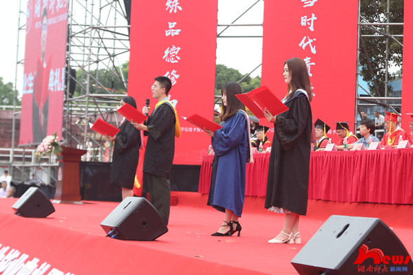 我校医学院护理学专业2008届毕业生、湖南省人民医院急诊重症监护室护士长、全国优秀共产党员、全国抗击新冠肺炎疫情先进个人,徐芙蓉校友致辞。她回忆了自己在师大求学的美好岁月,表达了对母校和毕业生的衷心祝愿,分享了个人作为抗疫一线志愿者的经历,鼓励学弟学妹们心存“家国有难,舍我其谁”的责任感,珍惜生活中的每一份经历,珍藏每一份感悟,将来在各自的岗位中成就闪闪发光的自己。