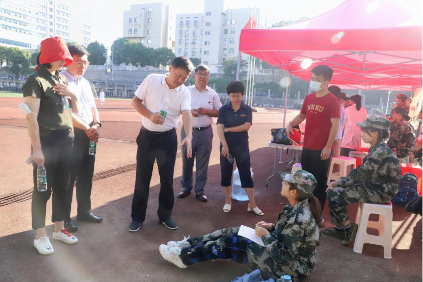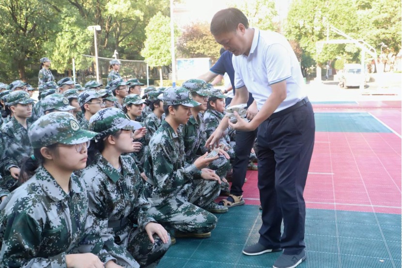 在咸嘉湖校区军训场地检查指导军训工作时,王辉不仅为新生发放月饼,还前往军训伤病员休息处与因身体状况无法参训的新生亲切交流,仔细询问其身体状况,嘱咐学生注意休息,并祝愿他们早日恢复健康,适应美好的大学生活。