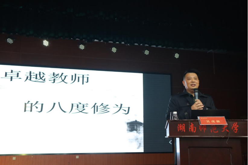 我校附属滨江学校党总支书记、湖南省创新课例一等奖获得者吴虎强老师以“卓越教师的八度修为”为主题展开讲座。他结合亲身经历和访学见闻,用讲故事和播视频的方式阐述了成为卓越教师需要具备的修为。他指出成为一名卓越教师需修炼八个“度”:一是度人度己,学会普度众生;二是广度,培养全球视野;三是深度,培养深刻的三观、深远的见识和深厚的功底;四是温度,拥有父母心和责任心;五是亮度,形成独特的教学风格;六是气度,练就“水为善下能成海,山不争高自及天”的胸襟;七是韧度,坚定百折不挠、百炼成钢的毅志;八是风度,学会“淡泊以明志,宁静以致远”的奥妙。吴虎强的授课让在座众学员耳目一新,受益匪浅。最后他提到“卓越教师应是教育家型的教师”,并希望我校学子们都能成为“为天地立心,为生民立命,为往圣继绝学,为万世开太平”的教育家。