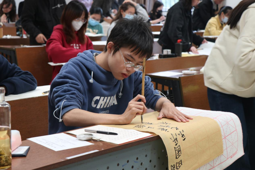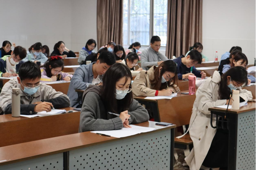 本次竞赛设置7个赛场,共有320名同学参加比赛。教育学科基础知识测试环节开始后,同学们认真答题,严格遵守考试要求,考场安静有序。随后,竞赛进入书法测试环节。硬笔书法测试内容为《劝学诗》;软笔书法测试内容为《田园乐七首·其三》。