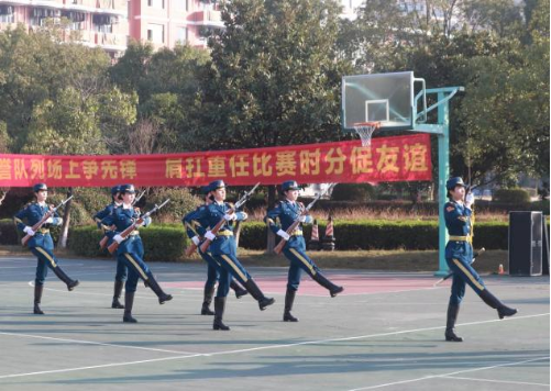 比赛开始之前,我校女子国旗护卫队为在场观众带来了枪操表演,其动作铿锵、步履坚定,展现了我校队伍昂扬奋进的精神面貌,赢得了热烈的掌声。此后,比赛正式开始。此次比赛校外组均为团体赛,主要有三个项目,分别是分列式、行进间托端枪互换与标兵就位。整个比赛过程中,我校队伍状态良好,表现沉稳,展示了我校队伍非同一般的默契感和扎实稳定的基本功。