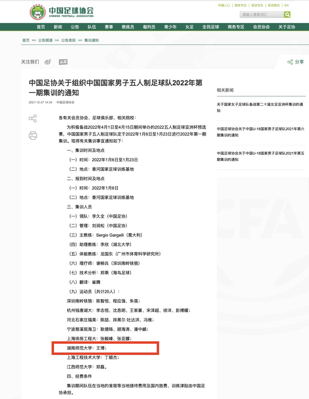 (通讯员 周颖)近日,中国足球协会发布《中国足协关于组织中国国家男子五人制足球队2022年第一期集训的通知》,我校体育学院2018级运动训练专业王博同学以优异表现成功入选。