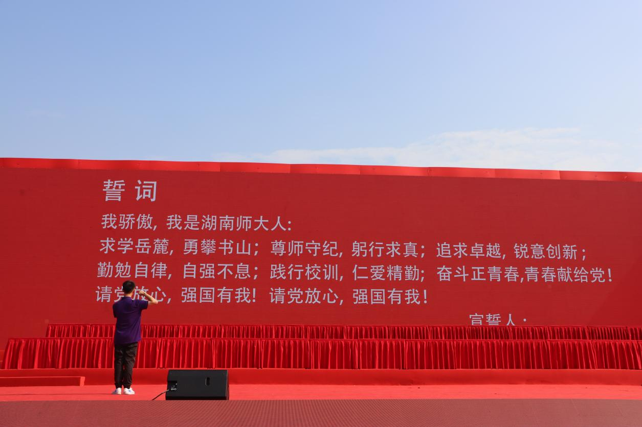 新闻与传播学院2022级播音与主持艺术专业本科生周雍城分享了自己对于红色故事与新时代青年责任的思考,同时作为领誓代表,带领我校全体本科新生向党致以“请党放心,强国有我!”的铮铮誓言!