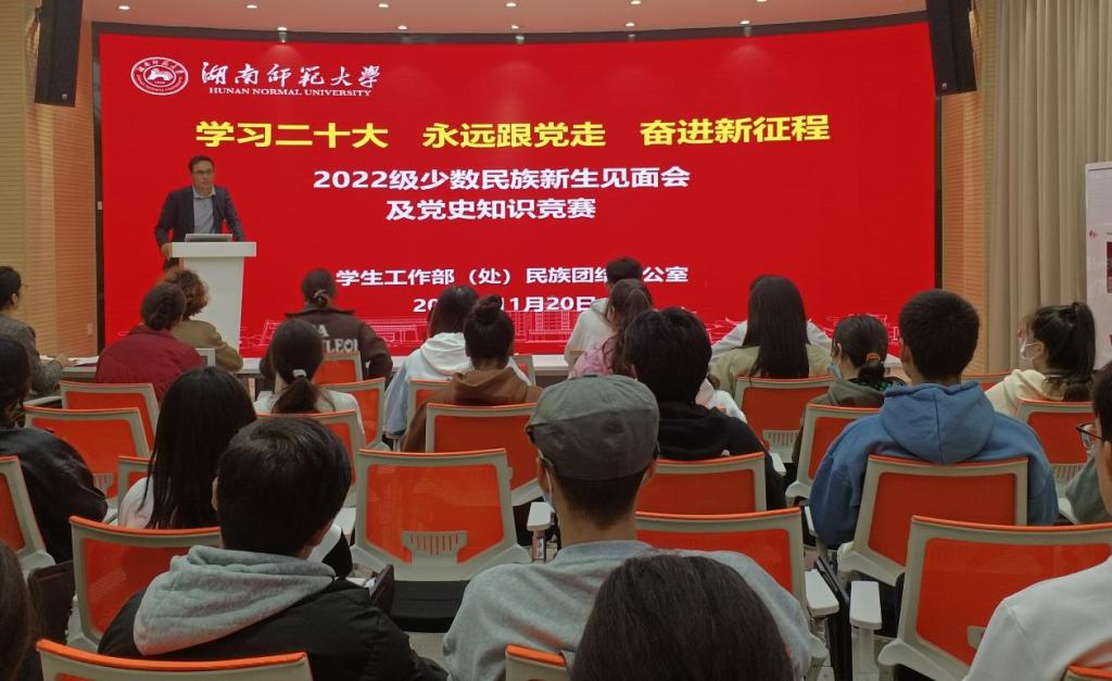 (通讯员 马雨欣)11月20日下午,学生工作部(处)在励德楼网络思政中心报告厅举行了一场迟来的特殊迎新见面会,欢迎从新疆维吾尔自治区、西藏自治区来校报到的少数民族新生,并开展了“学习二十大,永远跟党走,奋进新征程”党的二十大精神学习交流会暨党史知识竞赛。学生工作部(处)少数民族专职辅导员努尔买买提、努热曼姑丽、卡的力艳木及各学院少数民族新生代表参会。