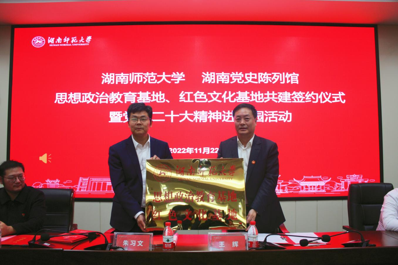 (通讯员 陶迎春 黄巾娥 高远瞩 陈榕)11月22日晚,我校与湖南党史陈列馆共建思想政治教育基地、红色文化基地签约仪式暨党的二十大精神进校园活动在中和楼中和讲堂举行。湖南党史陈列馆馆长朱习文,我校副校长王辉出席活动。