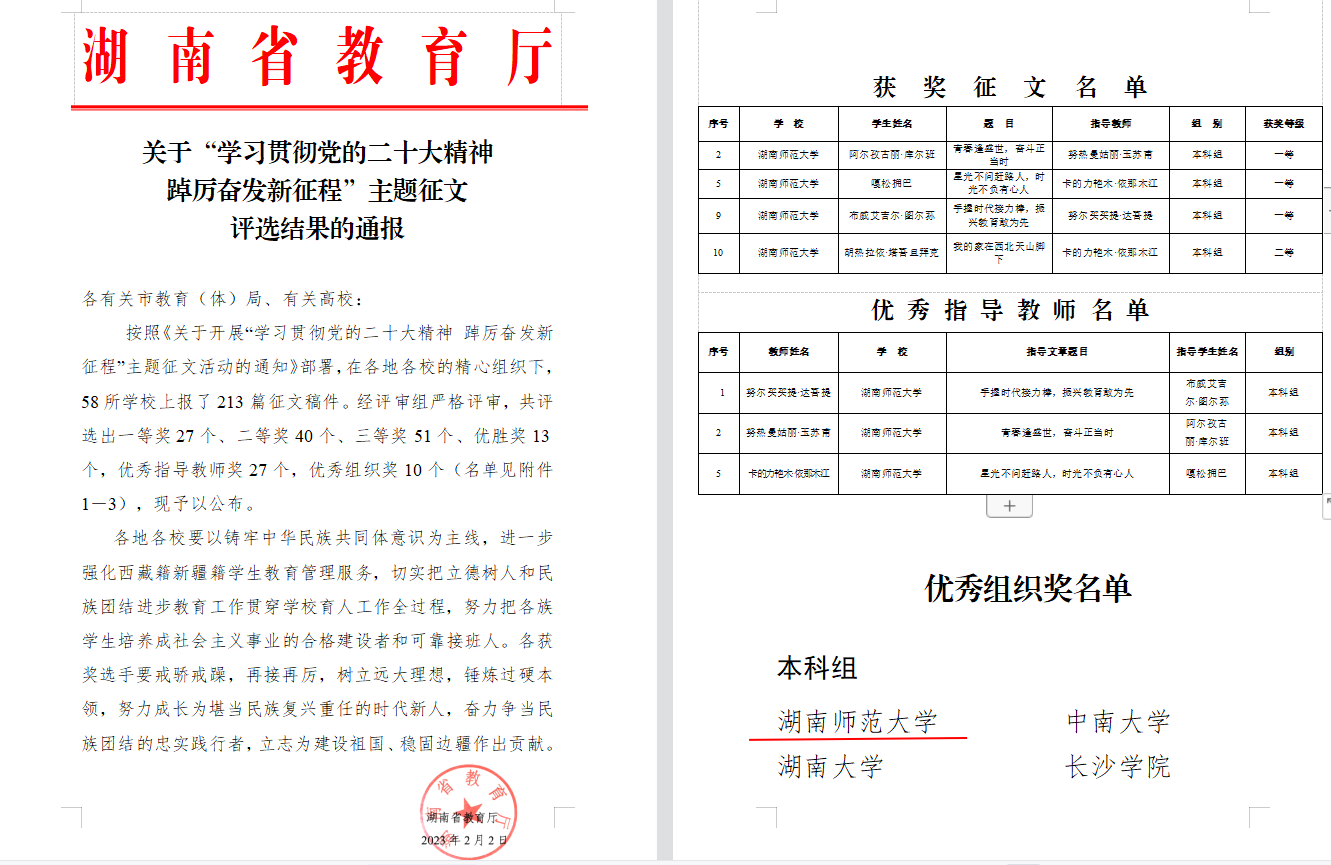 (供稿 民族团结办公室)近日,湖南省教育厅下发了《关于学习“贯彻党的二十大精神 踔厉奋发新征程”主题征文评选结果的通报》。在此次评选中,我校共有4篇征文获奖。其中,物理与电子科学学院2019级布威艾吉尔·图尔荪、商学院2020级阿尔孜古丽·库尔班、文学院2021级嘎松拥巴3人荣获一等奖,新闻与传播学院2022级胡热拉依·塔吾旦拜克荣获二等奖。此外,我校喜获“优秀组织奖”,学生工作部(处)努尔买买提、努热曼姑丽、卡的力艳木获评“优秀指导教师”奖。