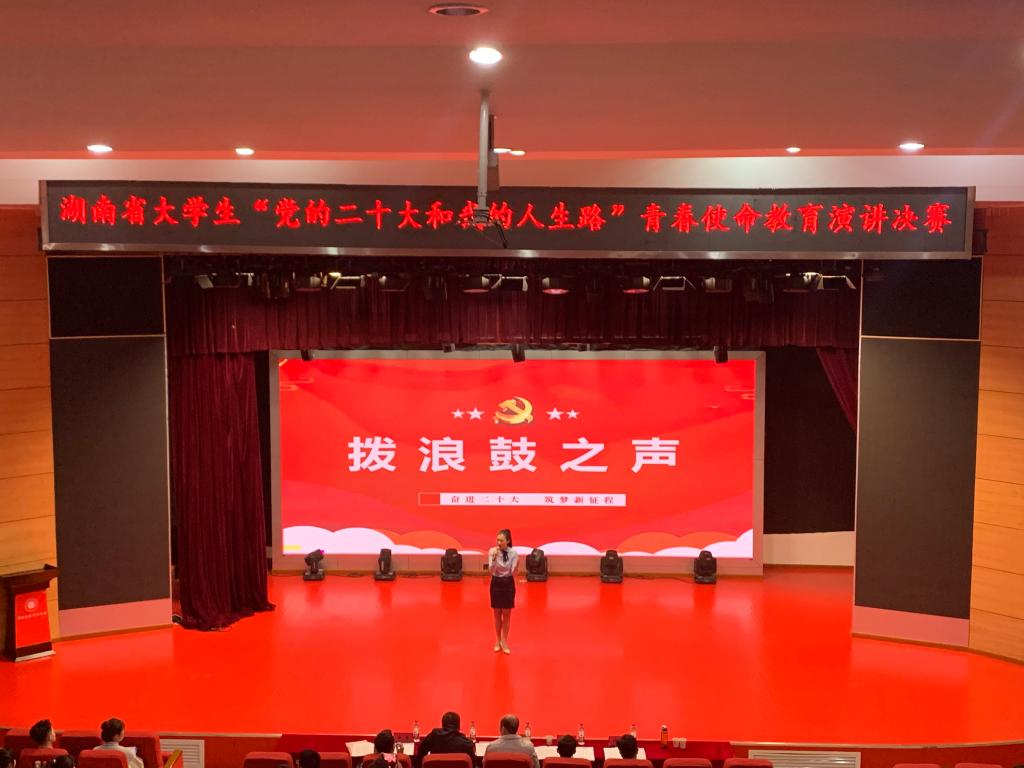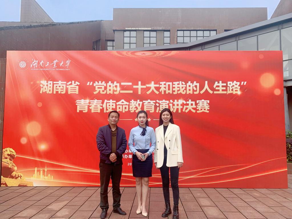 (通讯员 赵玥)近日,由湖南省教育厅主办,湖南工业大学承办的湖南省大学生“党的二十大和我的人生路”青春使命教育演讲比赛决赛在株洲举行,来自全省20余所院校的30名大学生,上演振奋人心的演讲。我校学工部选送、商学院学工办主任颜坤老师、工程与设计学院团委负责人张杜豆老师指导的2021级新闻与传播学院学生田晴宇以第一名的成绩荣获特等奖,我校获优秀组织奖。