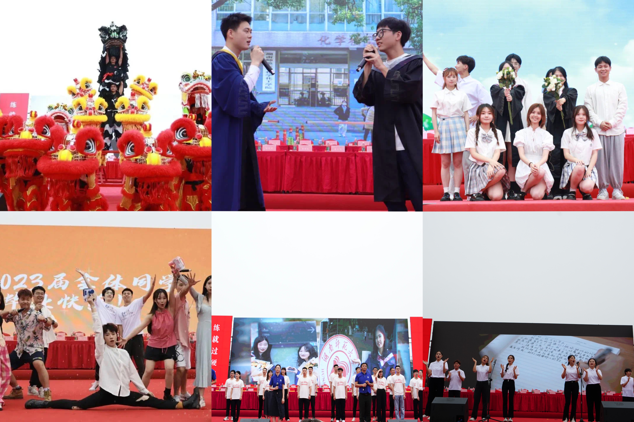 仪式开始之前,现场播放了全体毕业生辅导员祝福视频,并举行“青春为祖国歌唱”2023届毕业典礼文艺演出。体育学院带来开场表演《狮舞少年》点燃全场气氛;外国语学院带来多语种演唱曲目《栀子花开》,倾诉对青春别离的不舍;物理与电子科学学院和商学院学子演唱《凤凰花开的路口》,唤醒大家独特的青春记忆;学院党委副书记代表、毕业生辅导员带来歌曲《祝你一路顺风》,表达对毕业生的不舍和祝愿;音乐学院学子带来校园歌曲串烧《光阴的故事+鹿befree+海芋恋》,唱出了在师大的青葱记忆与光辉岁月;天籁合唱团合唱《当+这世界那么多人+再见》,和所有毕业生挥手告别。