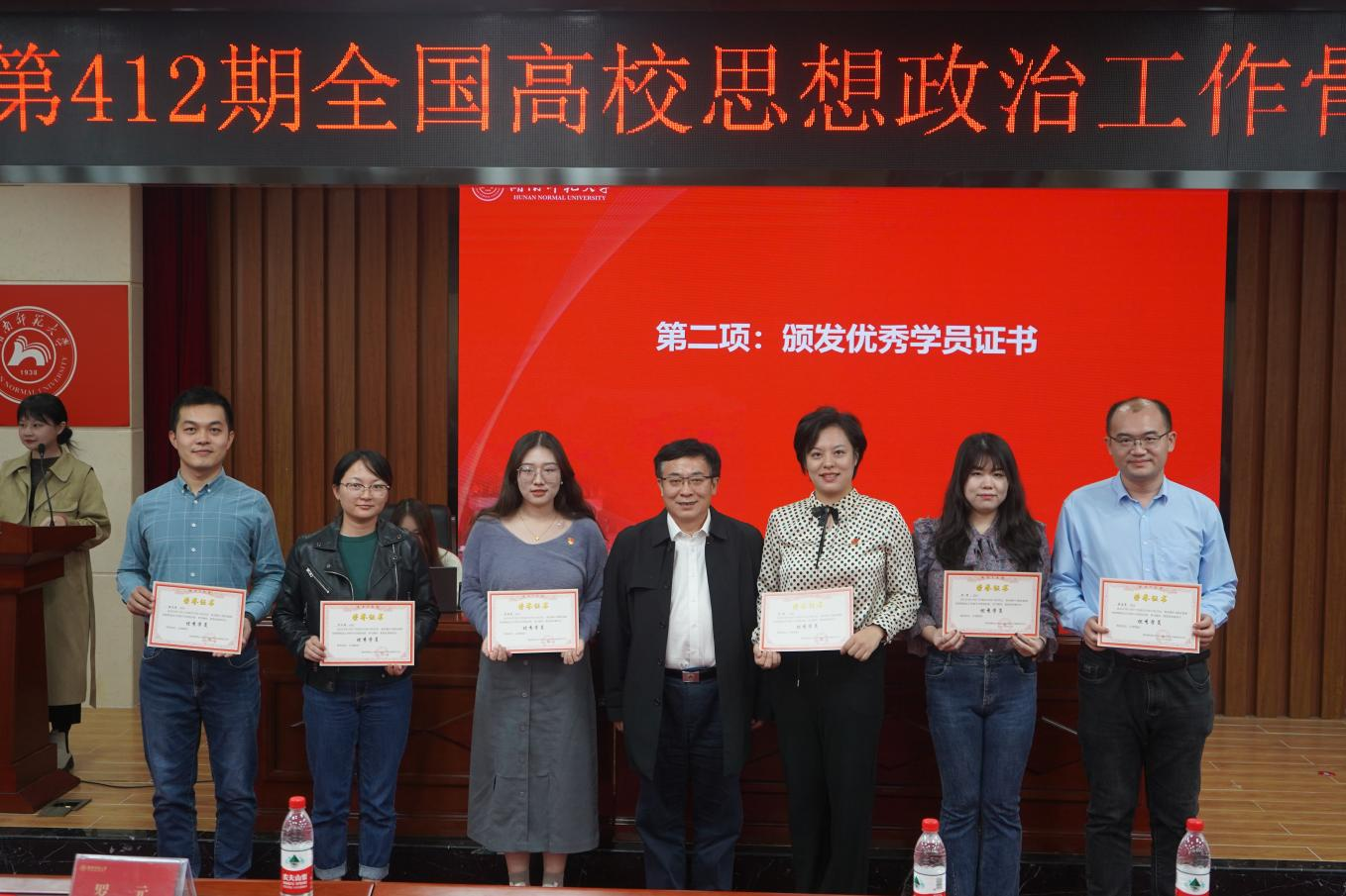 (通讯员 崔蓝心 黄巾娥 曾靖雯 叶浩然)10月20日下午,由我校承办的第412期全国高校思想政治工作骨干示范培训班结业仪式于中和楼129报告厅举行。我校学生工作部(处)部(处)长向发意、学生工作部(处)副部(处)长罗元出席此次仪式。仪式由我校学生管理科科长李斯主持。