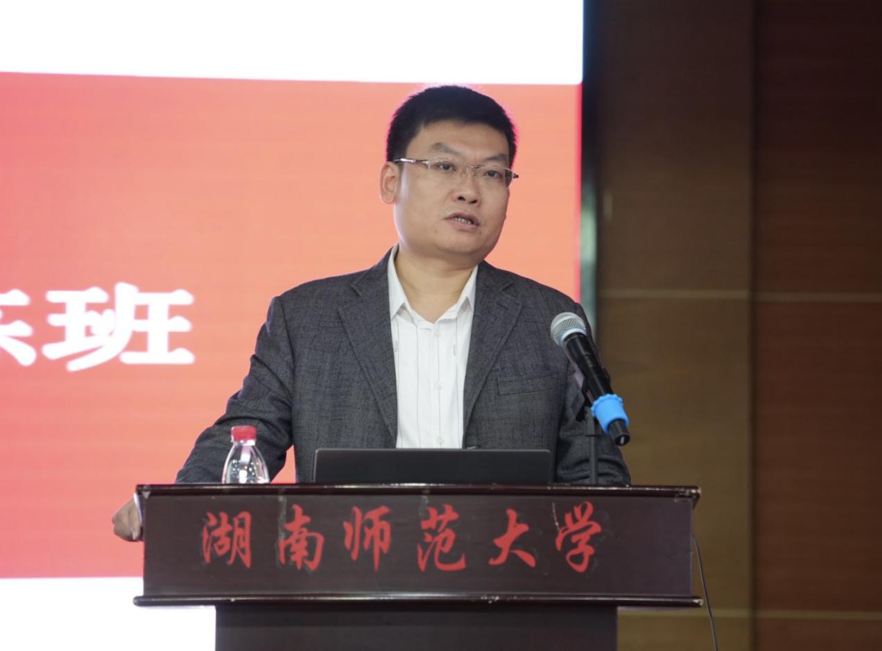 开班仪式后,长沙市新城学校校长,中学高级教师瞿林以“‘五力’驱动,做好新时代新教师”为主题开展讲座。他结合亲身经历和访学见闻分享了自己的教育经验。他表示,要培养学生,首先应当培养老师,没有优秀的教师队伍,学校的教育事业发展就没有把握。瞿林以周南中学为例,阐述了学校的优良教育能够给国家和学生带来深刻影响这一道理。他还引导同学们进一步思考教育以及成为教育家的意义,并启发同学们如何努力成为教育家。