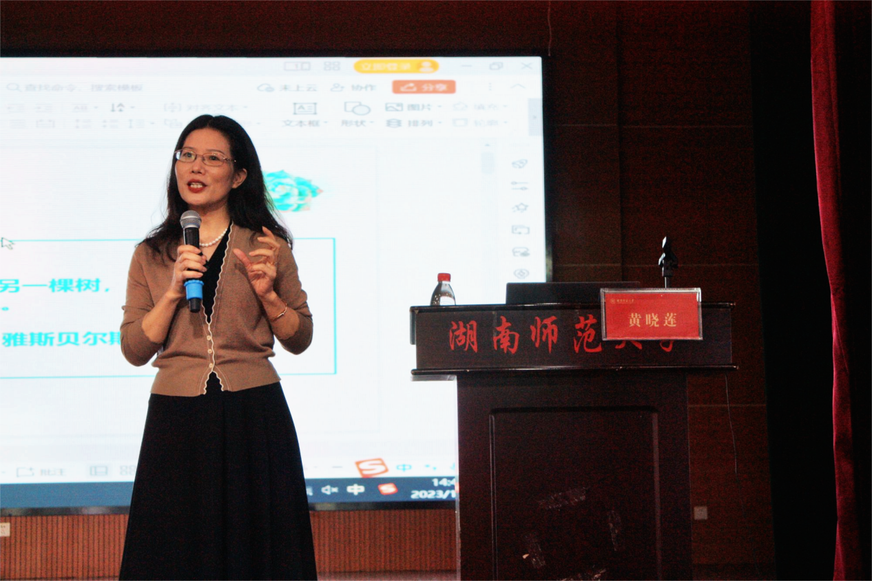 湖南湘江新区中学语文教研员,正高级教师,我校学科教学专业硕士研究生导师黄晓莲以“创设八环之美——微型课的设计艺术”为主题,以教师的教学意义为切入点,讲述了微课和微型课的区别。随后,黄晓莲从六个方面分析了微型课的美:一是教学内容中的内涵美,采用以简见丰等手法丰富教学内容;二是教学目标中的集中美,教学目标应当一目了然;三是教学导入中的情境美,以优美的情境揭示教学目标;四是教学过渡中的巧妙美,以承上启下等方式使教学衔接自然;五是教学设问中的有效美,设置问题和子问题以突出教学主题;六是教学讲解中的层次美,通过一定的结构将课程进行分层。