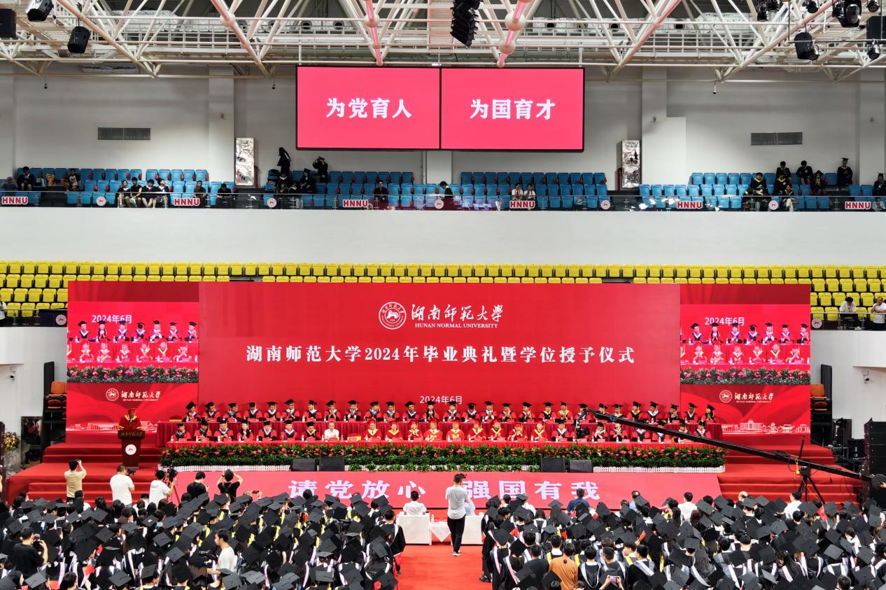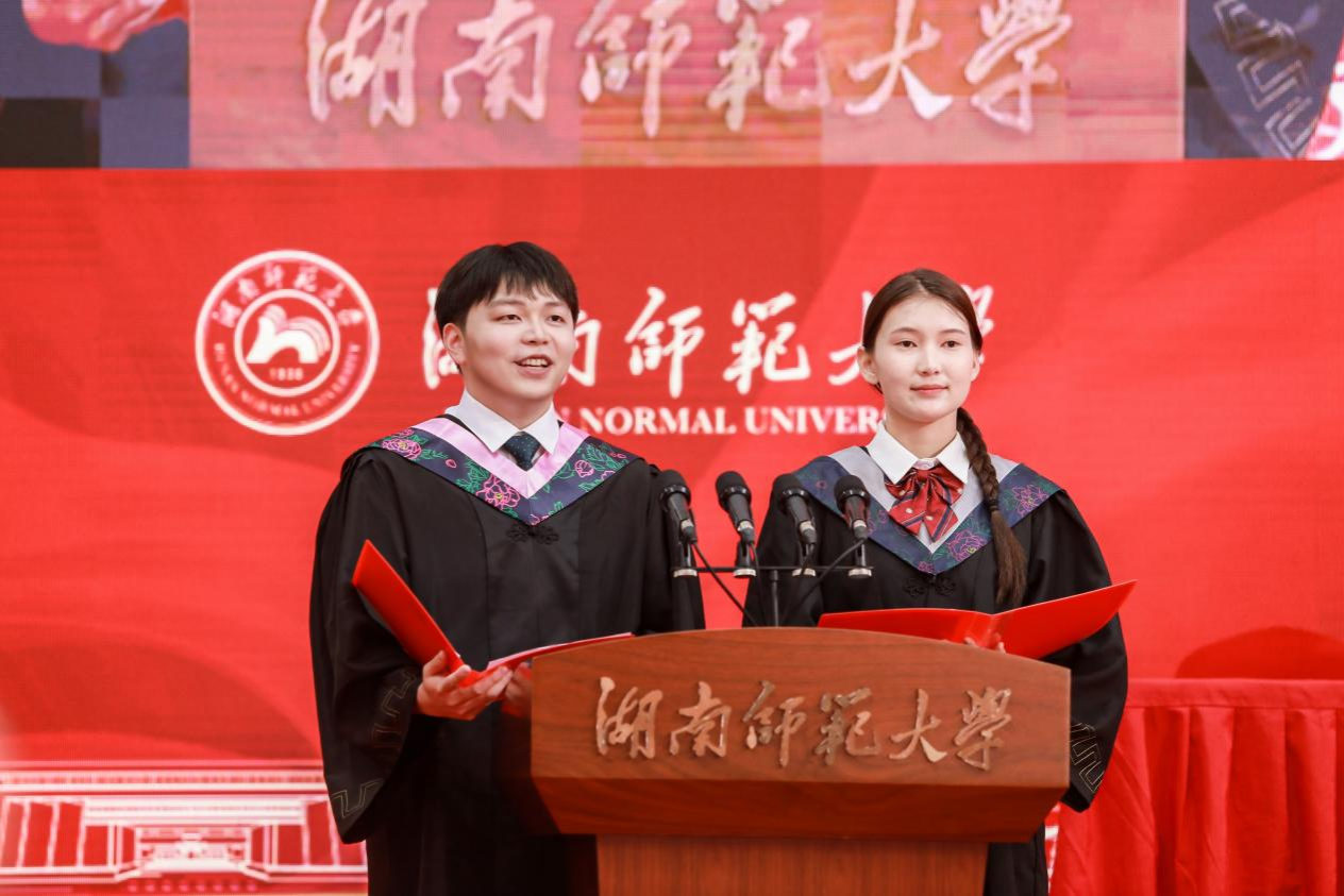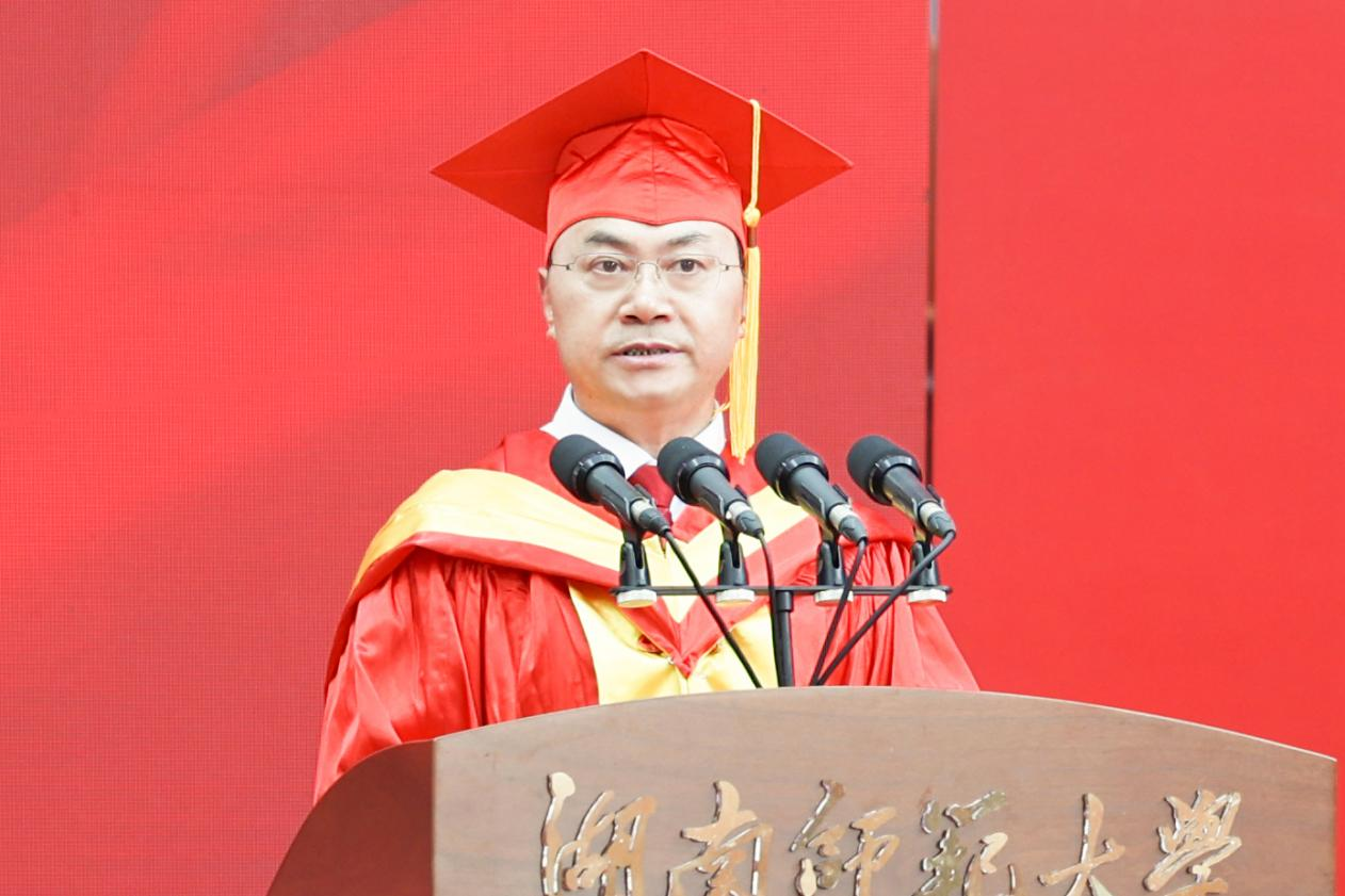 校长刘仲华以“一路向阳,华彩绽放”为题为本科毕业生同学们送去毕业祝福。他代表学校向全体本科毕业生们表示热烈祝贺,向所有关心、支持和帮助同学们成长成才的教职员工、亲友、校友和各界人士致以衷心感谢。他表示,同学们在师大四年的学习与生活中,与时代同呼吸,与师大共成长,一步步成长为“未来教育家”“师大之星”“红色主讲人”。临别之际,他对毕业生提出三点希望:一是要以“功成必定有我”的执着,心系家国,逐梦前行。广大青年作为中国式现代化建设的中坚力量,要心怀“国之大者”,勇立时代潮头,乘风逐梦、踏浪歌行。二是要以“不畏浮云遮望眼”的定力,常怀仁爱,向阳前行。面对眼前纷繁复杂的世界,希望即将步入社会的师大学子以前辈校友为榜样,不忘“仁爱精勤”的火种,坚守师者的使命重任,不断擦亮“湖南师大”的名片。三是要以“千磨万击还坚劲”的豪情,矢志奋斗、勇毅前行。希望广大毕业生行而不辍、无畏向前,以青春之我、拼搏之我,书写时代青年的壮丽华章。