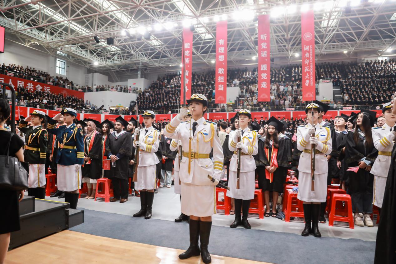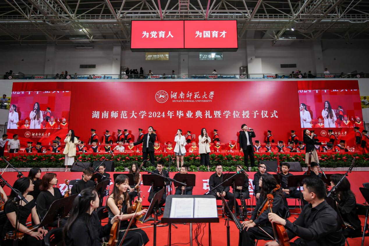 典礼开始前,学校举行了2024年毕业典礼文艺演出,在校师生们为毕业生带来了《红旗颂》《浏阳河》《卡门序曲》《洞庭鱼米香》《雷电波尔卡》《拉德斯基进行曲》《花开忘忧》《离别开出花》《我和我的祖国》《红玫瑰》《康塔塔舞曲》《茶花女》(选段)《沧海一声笑》《青春之声》等精彩节目表演。