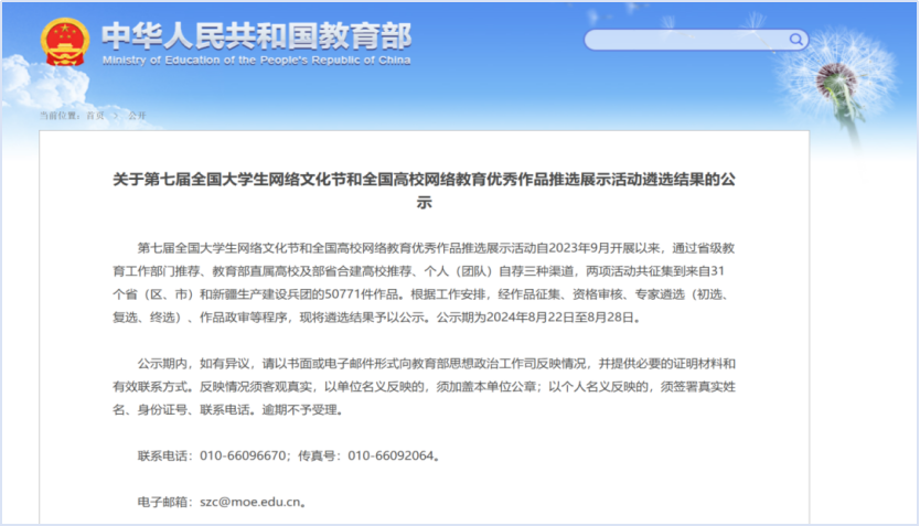 (通讯员 崔蓝心 张馨月)近日,由教育部思想政治工作司和中央网信办网络社会工作局主办的第七届“全国大学生网络文化节”和“全国高校网络教育优秀作品推选展示活动”的遴选结果在教育部官网公示,我校共5项作品入选。