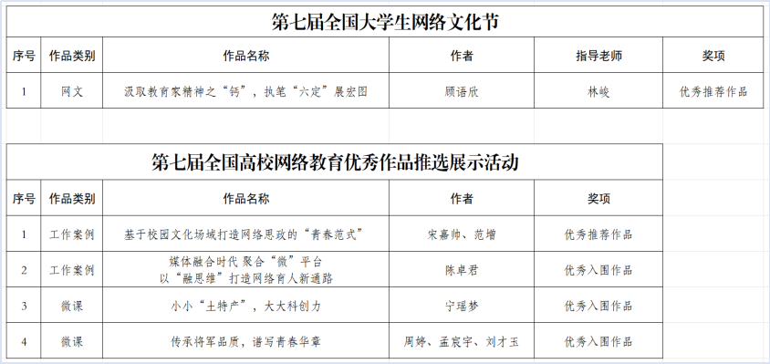 在第七届全国高校网络教育优秀作品推选展示活动中,我校宋嘉帅、范增的工作案例《基于校园文化场域打造网络思政的“青春范式”》获评为“优秀推荐作品”;陈卓君的工作案例《媒体融合时代 聚合“微”平台 以“融思维”打造网络育人新通路》获评为“优秀入围作品”;宁瑶梦的微课《小小“土特产”,大大科创力》,周婷、孟宸宇、刘才玉的微课《传承将军品质,谱写青春华章》获评为“优秀入围作品”。