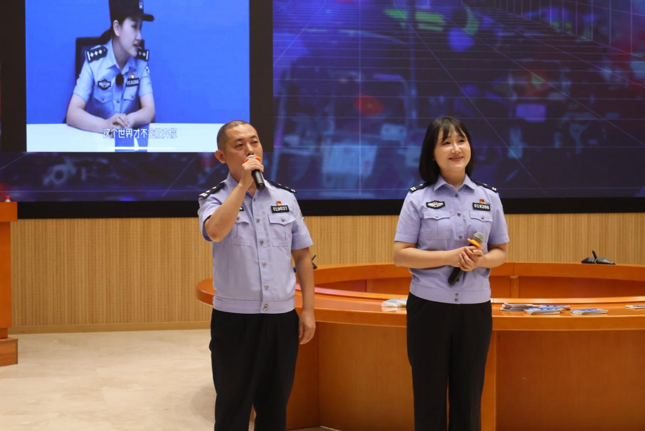 长沙市公安局天心分局网安大队副大队长梁慧讲述了自己从警多年的一线反电诈经历,从民警的视角分享了对于打击电诈的不易和决心,让大家真切地感受到网络诈骗的危害。在互动环节,她提出许多富有趣味的知识问答,并在现场发放礼品。随后她播放的自制网络安全宣传片《较量》,也赢得现场同学们的阵阵掌声。