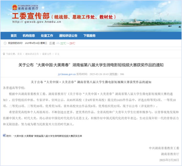 本次大赛由中共湖南省委教育工委、湖南省教育厅主办,自活动启动以来,我校积极组织师生参赛,旨在通过以赛促践,以青春视角发现和传播中国大美、时代大美,用心讲好中国化时代化的马克思主义,积极作好中国式现代化的青年表达,生动呈现年轻一代的青春活力和无限创意,努力成为堪当民族复兴大任的时代新人。