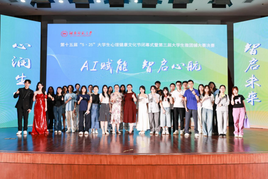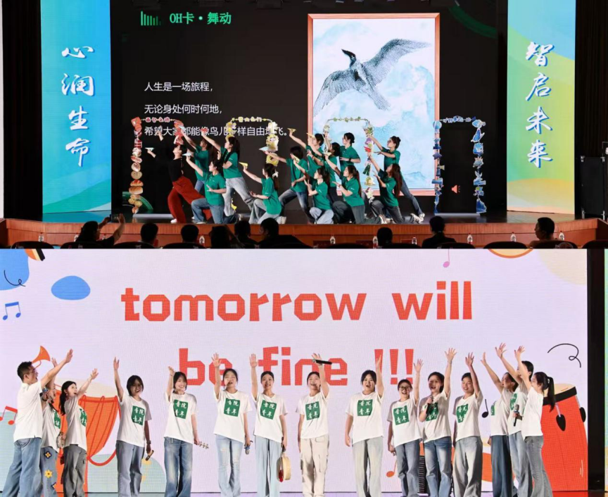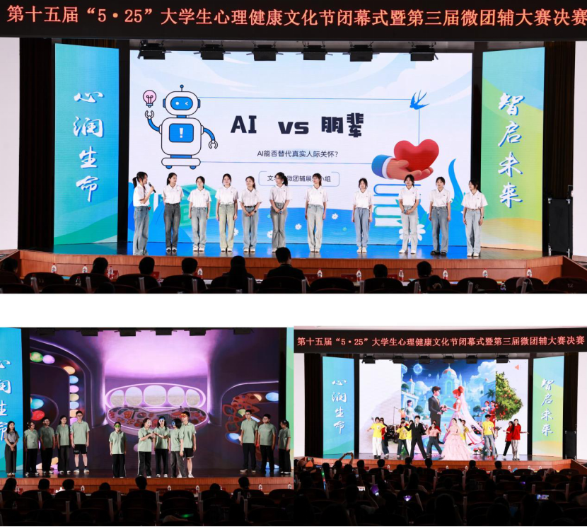 此次大赛以“AI赋能·智启心航”为主题,10支参赛队伍聚焦大学生常见心理问题,带来了精彩纷呈的微团辅节目。《我的睡眠我作主》倡导通过运动的方式缓解睡眠问题,开启早睡生活;《AI VS朋辈》围绕线上AI即时助手与线下真情朋辈心委,探讨“人机携手,健康同行”的育人新模式;《情绪解码·音AI相随》结合AI与音乐,解锁情绪密码;《AI柔光抚平寝室矛盾褶皱》用AI化解寝室矛盾,发挥科技调和关系的作用;《溯古见心:历史文物创新嘉年华》让青铜瓷器化作“表情包”,帮助大家科学应对压力;《智启职航,oh!舞动》采用欧卡与身体舞动技术,为职业发展提供新思路;《AI共情实验室》以AI情绪实验,表达科技结合心理、洞察自我的理念;《指间非遗:AI与艺术的心灵之约》以非遗融入AI,诠释技术与人文共融、在传承与创新中找到心灵平衡的导向;《AI智护·平安校园》通过反诈互动,体现AI反诈、筑牢校园安全防线的作用;《苦尽柑来遇见你》以AI小柑的故事,展现在逆境中重获生命回甘的哲思。体育学院开场舞《再次重逢的世界》和我校少数民族同学代表带来的终场表演《葡萄架下的篝火》点燃了全场氛围。