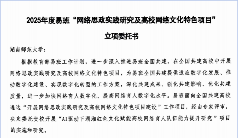 近日,教育部易班公布了2025年度课题立项名单,全国共10项。由我校学生工作部网络教育办公室申报的课题《AI驱动下湖湘红色文化赋能高校网络育人队伍能力提升研究》获批立项。