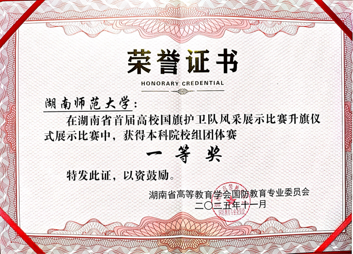 本次会议总结了2025年度国防教育工作,研究了2026年工作及专业委员会“一五五”规划,并对本年度的各项国防教育赛事进行表彰。其中,我校荣获2025年湖南省高校国防教育研究与实践先进单位、升国旗仪式展示赛本科组一等奖、队列会操本科组一等奖等多个奖项。学生陈桥桥的作品《一刻度》荣获军训短视频大赛本科组一等奖。
