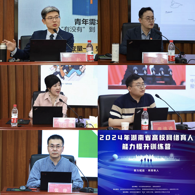 此次训练营共设置了五场专题讲座、两场“湘思育人·思享会”。专题讲座邀请了全国网络教育名师、山东理工大学岳松,全国网络教育名师、长沙师范学院贺文龙,吉林省高校网络思想政治工作中心执行主任、长春理工大学王佳惠,中国大学生在线新媒体主编、中教华影首席编辑张洪涛,教育部易班产品经理、青梨派产品负责人张睿,分别从青年有效沟通、网络作品创作、高校思政工作数字化转型、师生网络素养提升、人工智能赋能高校思政等内容开展培训授课。“湘思育人·思享会”分别邀请省内本科院校、二级学院、专科院校网络思政骨干代表和第二批“湖南省高校网络教育名师培育支持计划”入选者,从网络育人能力提升、网络育人平台构建、易班建设与管理,以及项目建设情况、工作成效与经验、项目特色与创新等方面开展分享交流。