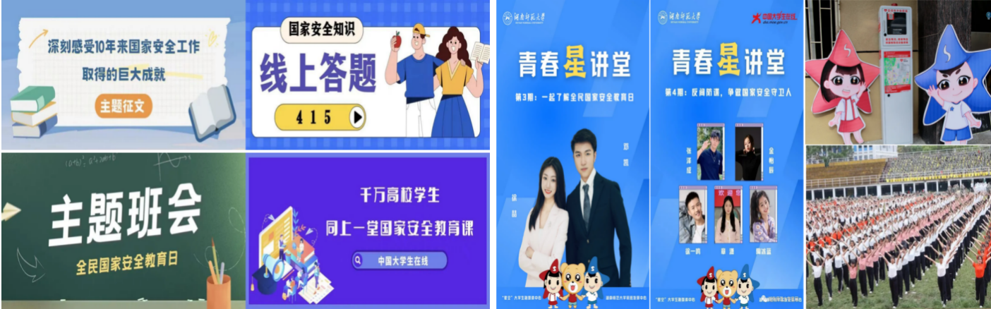 织密宣传教育“安全网”。一是更新安全教育内容。开展“青春相伴”新生安全第一课,围绕国家安全、网络安全、人身安全等多方面的安全知识“入学礼”;结合重大活动或时间节点,定期开展安全主题班会、安全知识竞赛等,让安全知识赋能青年成长。二是创新安全宣传方式。依托全媒体平台,打造《青春星讲堂》《青春之光》等栏目,让学生从安全教育的“受教者”变为“主讲人”;发挥榜样带动作用,组建“校园安全代言人”团队,学生与省公安厅、消防支队、长沙公安等专家共话安全。三是焕新安全活动形式。面向全校推广安全急救操,普及AED自动体外除颤机等急救培训业务,开展网络安全进校园、进课堂活动,借助全媒体宣传、全资源融入、全方位覆盖,确保安全意识入脑入心。
