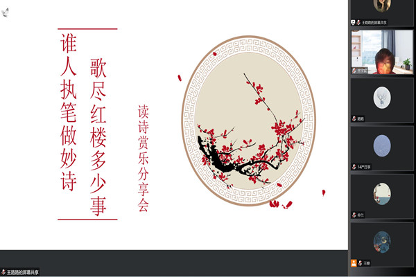 (通讯员 蒋馨仪 齐宇宸)1月1日晚,朝暾文学社开展“品悟红楼经典”系列活动子环节二“读诗赏乐”分享会。此次活动由朝暾文学社邀请对红楼梦有心得的同学进行分享,以线上会议的形式进行,参与人数共计70余人。