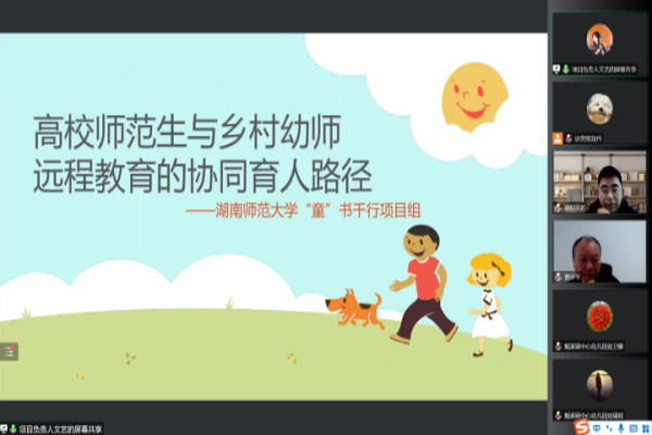 (通讯员 曹馨予 王欣辰 姚心蕊)1月5日上午,教科院“童书千行——高校师范生与乡村幼师远程教育的协同育人路径”项目组在腾讯会议上召开了第一次云端见面会。此次会议由运营部成员刘丹主持,教科院党委副书记欧阳文芳、学前教育系教授曹中平、烟溪镇中心幼儿园园长刘瑞娟参与会议。