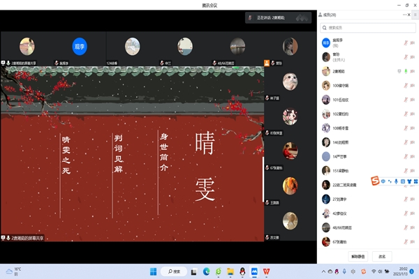 (通讯员 施观李 龙俏 伍佳欣)1月13日晚,朝暾文学社开展“品悟红楼经典”系列活动子环节三“品红楼人物,悟人生活法”分享会。此次活动由朝暾文学社邀请对《红楼梦》中人物有心得的同学进行分享,以线上腾讯会议的形式进行,参与人数共计30余人。