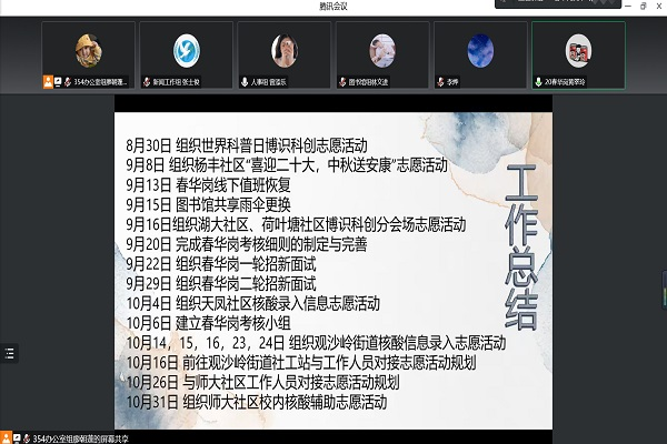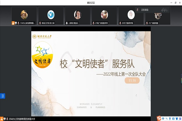 (通讯员 陈羽娜 张士俊)为使新队员深入了解“文明使者”服务队,激发队员工作热情,增强全队凝聚力,11月19日晚,我校“文明使者”服务队于线上召开本学期第一次全队大会。廖朝蓬、曾添乐主持此次会议。指导老师赵玥和“文明使者”服务队全体队员参加会议。