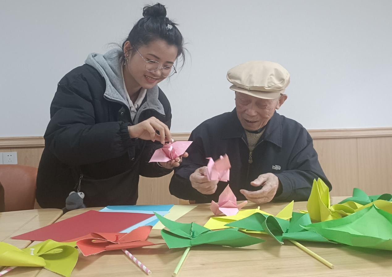 活动开展前,志愿者们先在乐来龄红花坡老年养护院门前集合,养护院院长向志愿者们简单介绍了养老院老人的基本生活情况和注意事项,随后一同到达折风车活动场地。志愿者们被分成几个小组,成员们各司其职、分工协作。志愿裁剪纸张,协助爷爷奶奶们折叠成型,完成风车固定。此外,爷爷还教志愿者们折千纸鹤并介绍其美好寓意。志愿服务过程中,志愿者们积极热情地同老人聊天,分享日常。离开前,志愿者们纷纷在卡片上写下对爷爷奶奶的祝福,并与爷爷奶奶们合影告别。