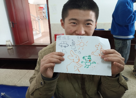 志愿者们到达光爱之家后,智力障碍人士(以下称“智力障碍朋友们”)热情地跑向志愿者们给予他们拥抱。智力障碍朋友们在志愿者们的引导下分别介绍了自己的姓名、年龄以及爱好,相互之间增强了对彼此的了解。“寻光”志愿者们为智力障碍朋友们讲述了几个有关雷锋的小故事,大家认真地聆听雷锋同志的事迹,有的点头,有的鼓掌,领悟每一个人都应当做好人做好事的道理。为更好地将雷锋精神铭记于心,在故事的结尾他们与志愿者们一同唱起歌曲《学习雷锋好榜样》。在紧接着的绘画创作的活动中,智力障碍朋友们按照志愿者所教的几个图案,积极发挥自己的想象,创作了一幅又一幅漂亮的作品,迫不及待地向志愿者们展示自己的绘画成果,并希望带着自己的作品与志愿者们留下合影。与此同时,志愿者们也与智力障碍朋友们开展了其他丰富多彩的活动,如跳舞,玩“跳房子”、“木头人”等小游戏,进一步在游戏互动中加深友谊,传递快乐与温暖。