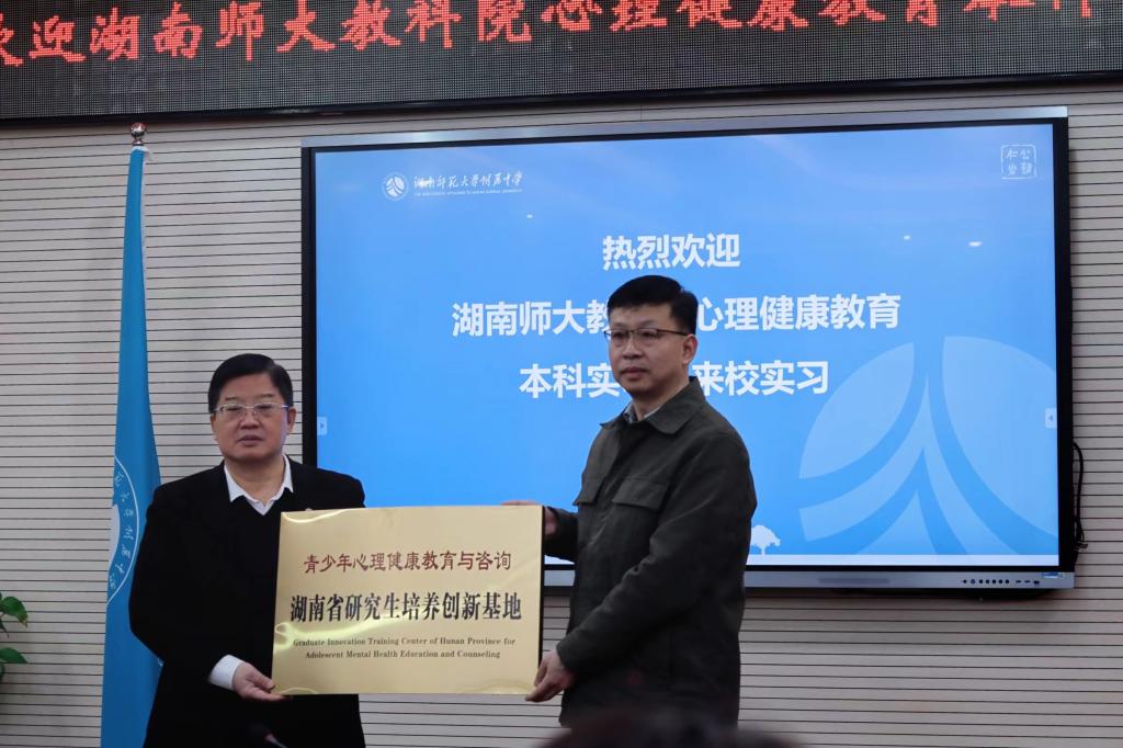 (通讯员 蒋璧如 张润佳)为欢迎教育科学学院赴湖南师大附中实习队(心理)进校开展实习工作,加深师大附中与实习队之间的了解和沟通,3月20日上午,实习队于湖南师大附中校史馆参加了实习欢迎仪式暨授牌仪式。我校教育科学学院副院长丁道群、师大附中党委书记黄月初及领导班子、实习队指导老师与全体成员参加了此次欢迎仪式。