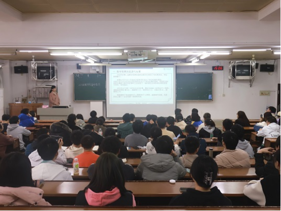 讲座包含数学竞赛的起源、题目特点、相关政策三个方面。崔登兰简要概述数学竞赛的起源与发展,介绍了我校数统院在竞赛获奖上从无到有的过程。就题目特点方面,崔登兰详细讲解了高代、数分、空解的备考提纲,使同学们提前了解到考题内容。她概述了我校数学竞赛的鼓励政策,以激发学生们对数学竞赛的热情。最后,崔登兰向同学们推荐几种校赛培训参考书,并介绍了正式比赛的场地。