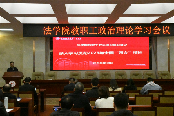 (通讯员 马书晨 陈亚希 寻梦洁 黄洁)3月30日下午,法学院在205报告厅召开主题为“深入学习贯彻2023年‘两会’精神”的教职工政治理论学习会议。院长肖北庚,院正处级专职组织员陈胜国,副院长欧福永、耿自强、周刚志、何燕华,院党委副书记曹俊峰参加会议,会议由院党委书记唐建文主持。