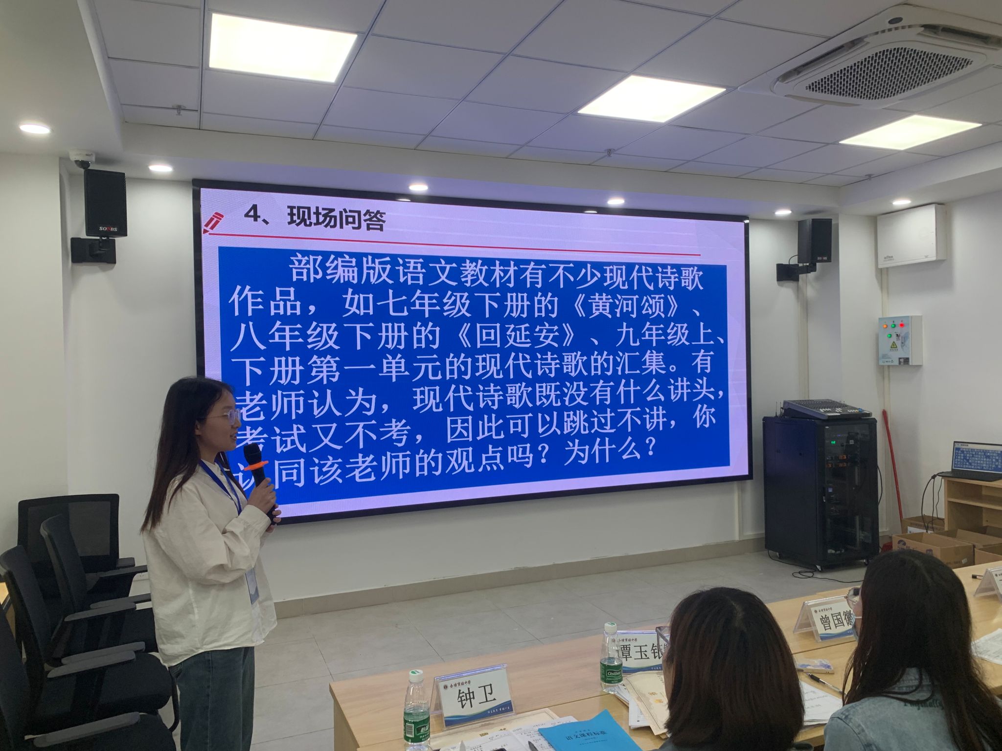 北滘中学专家王丽君讲述自己的教师成长经验,对顺德区青年教师教学能力大赛项目赛制进行解读,从多维视角、追问策略、细读文本三个角度分析文本解读策略,并分享诸多答题技巧。活动现场,杏坛初级实验中学教师钟卫、谭玉银与王丽君进行交流,深入研读部编版初中语文教材,实习队队长赵晨西现场回答有关“现代诗歌教学”的考题,获得王丽君的高度评价。王丽君表示:“从问答环节的互动来看,ok138cn太阳集团文学院的实习队专业素养扎实、师范技能优秀,队长能力突出,队员态度勤恳,他们的到来为杏坛教育事业注入生机与活力。”
