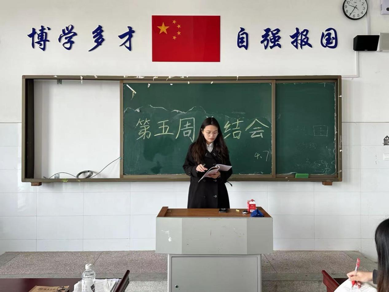 会上,实习队队长邓睿从教学教研、对外宣传、班级管理、日常考勤等方面对上一个月及本周的实习工作进行了全面总结,并对下一周的日常教学工作及宣传工作进行了细致安排。郭鹏飞老师鼓励全体队员主动承担日常工作,积极参与教学教研活动,加强与教学指导老师和教育指导老师的沟通交流,在工作中锤炼师范技能。郭鹏飞建议实习队积极组织队内听课评课活动,加强队内交流协作,发扬团队精神。会后,就实习队无固定备课教室的问题,郭鹏飞听取了实习队员的需求,积极与实习学校沟通协商。在大家的共同努力下,这一问题得到妥善解决。