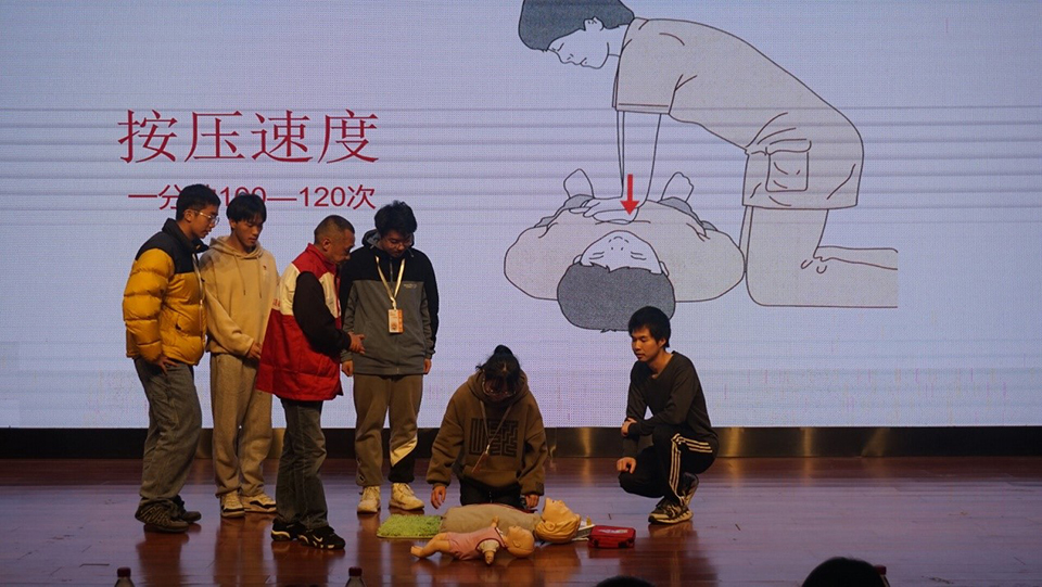 此次培训分为理论知识学习和实操培训两个部分。在理论学习环节,孙怀东从“什么是急救”、“心肺复苏的步骤及注意事项”、“如何使用AED”三个部分进行理论知识讲解。他表示日常生活中,意外伤害很难避免,应急知识是一项具有实用性的知识,学习并掌握急救技能,可以在一定程度上避免死亡事件的发生。在实训环节中,孙怀东向同学们分别演示心肺复苏和使用AED的正确方式,并对上台实训的同学进行指导。他表示,网络上存在对急救知识的虚假宣传,希望同学们认真领会急救技能的动作要领,认识到正确实施急救措施的重要性。