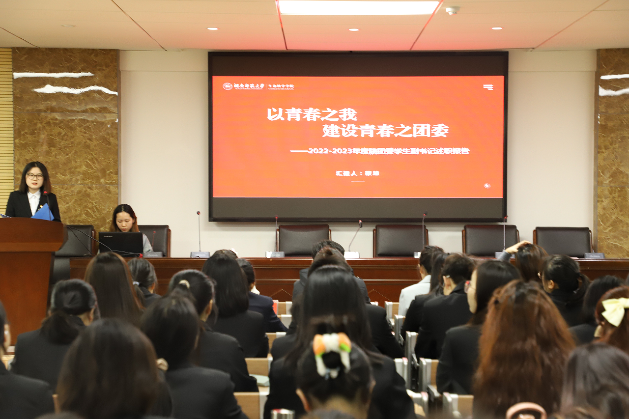 (通讯员 毛烨宇 陈怡辛 龙婵)4月10日中午,2022-2023年度生命科学学院(以下简称“生科院”)学生干部述职大会于生科院三号楼B栋307学术报告厅举行。2019级辅导员李翠玲、2020级辅导员兼团委负责人罗静伟、2021级辅导员刘迎彬和2022级辅导员兼学工办负责人周冲出席此次活动。生科院团委青年发展工作部干事李宇璇担任此次活动主持人。