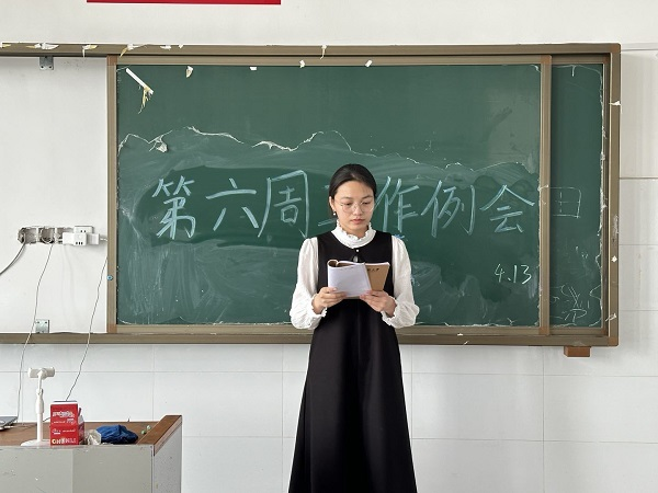实习队队长邓睿从教学教研、对外宣传、班级管理、教学实录等方面对本周实习工作进行了总结,并对下周的日常教学工作及宣传工作进行了细致安排。她表示,队员们在观摩教学指导老师的课堂之后,一定要及时做好记录,学习教学指导老师的教学设计、教学方法,博采众长,做到听有所思、听有所悟、听有所得。