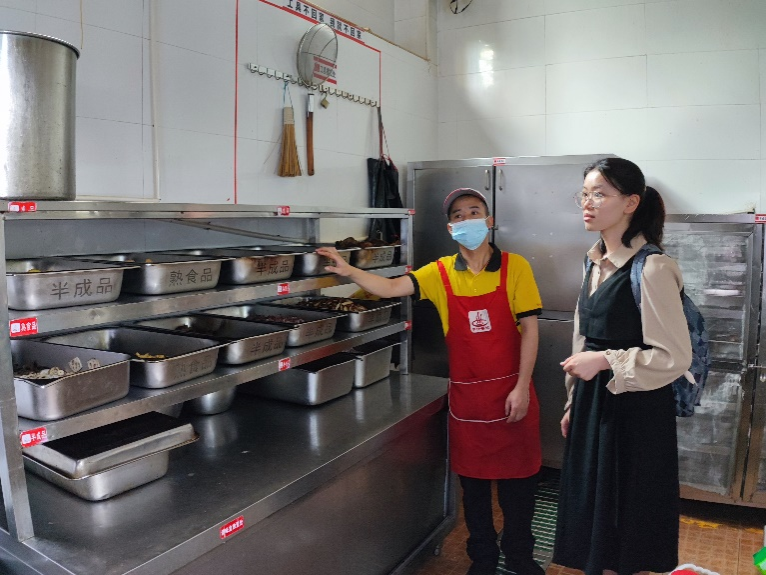 在翟小明的引领下,李文虎等人走进后厨,认真检查了每个角落。后厨内部按准备餐食流程分为多个区域,例如切配区、蒸饭区等。每个区域的器材设备按照标签摆放得井井有条。参观过程中,李娟娟向翟小明询问学生反馈问题的解决情况,了解一些突出问题的解决进度。翟小明表示今后会继续接受同学们的监督,把控菜品质量,加强天马食堂的管理。参观完毕后,宿权部结束此次考察。
