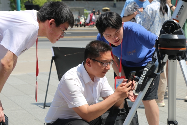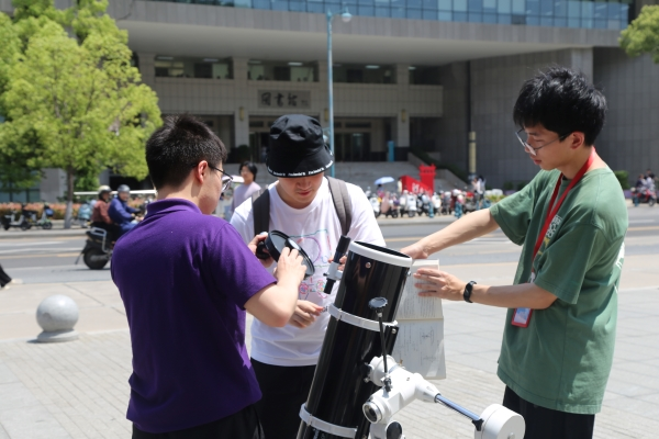 (通讯员 段楚楚)4月17日中午,物理与电子科学学院天文协会于五舍广场举办志愿活动——观测太阳黑子。2021级辅导员韩翔宇参与此次活动,天文协会各理事担任志愿讲解员。