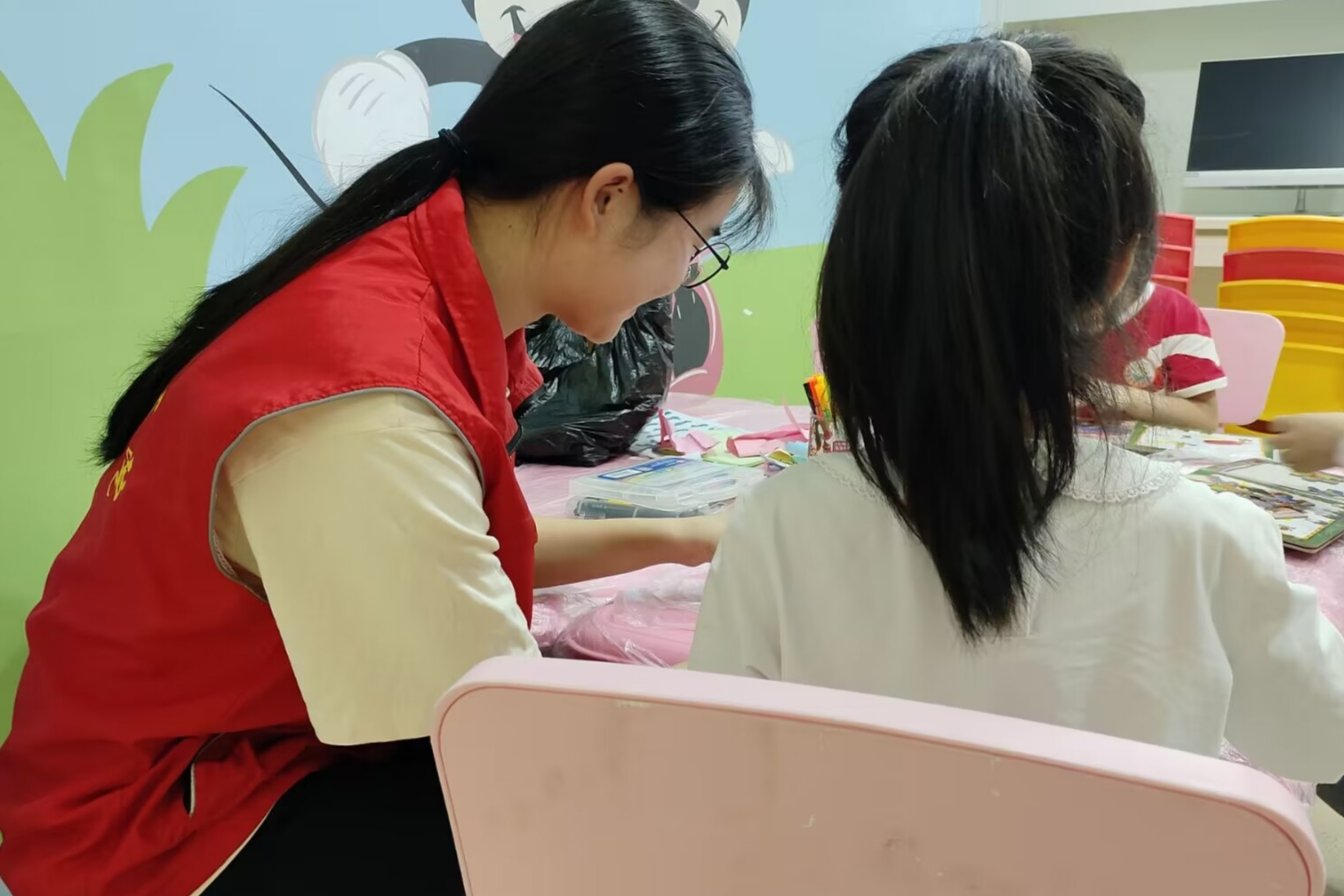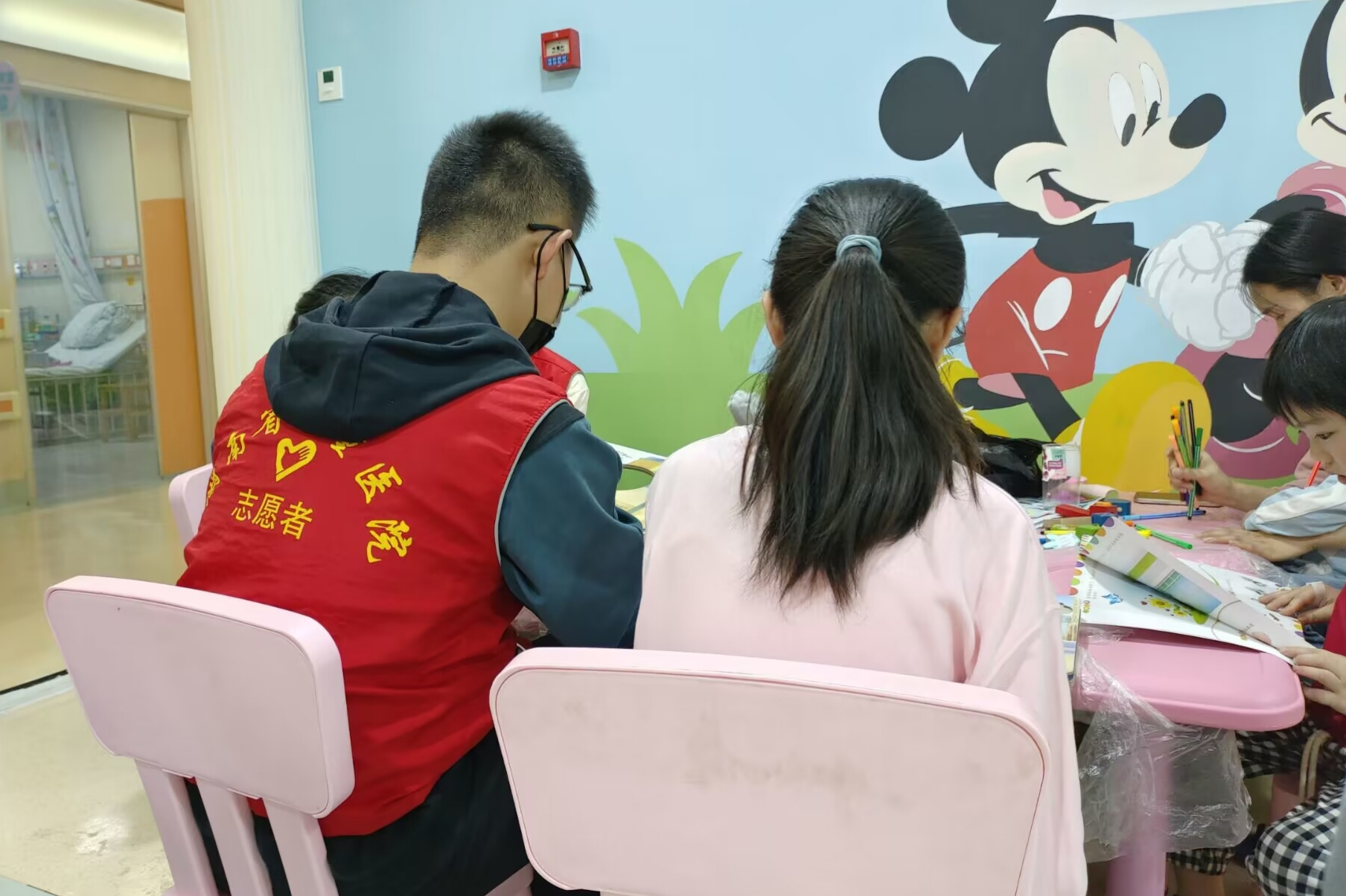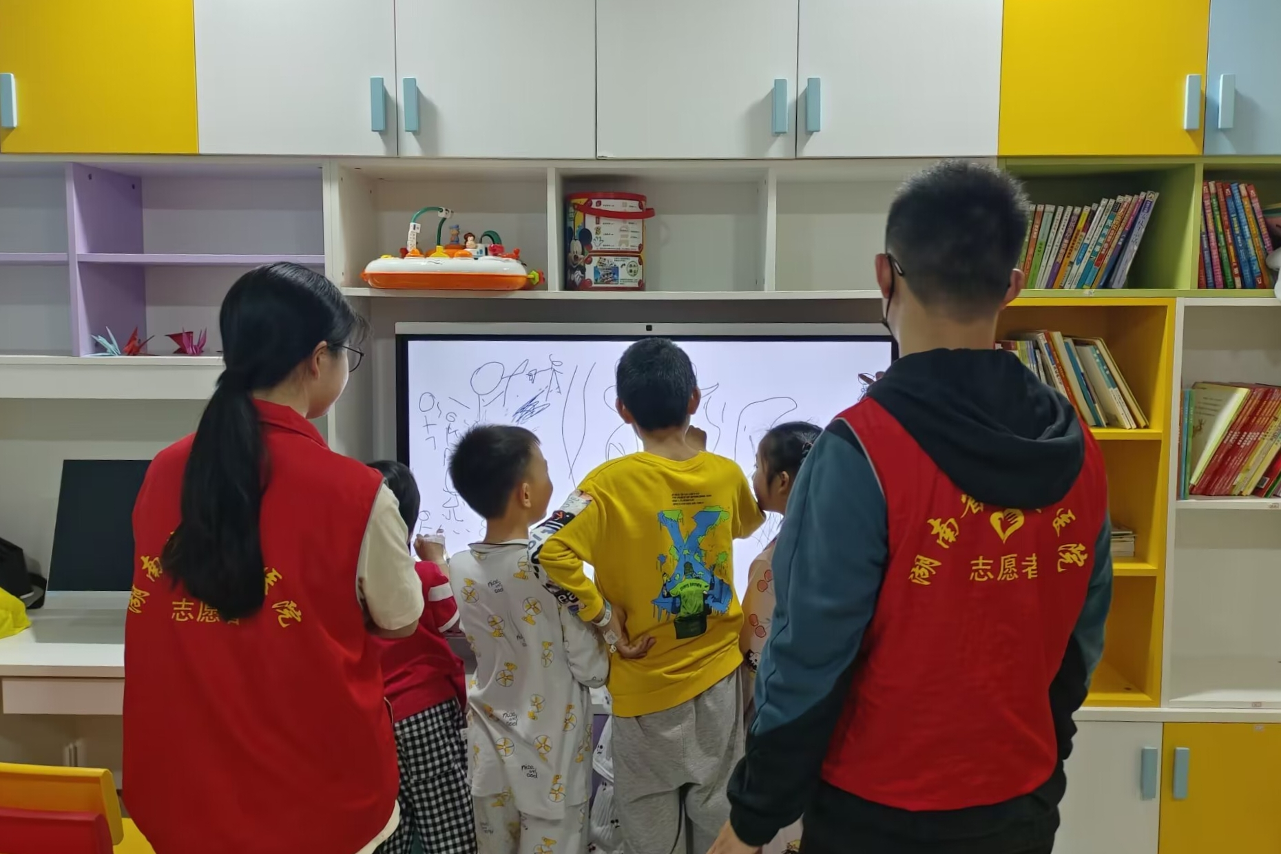 活动当天,志愿者们早早就到达湖南省儿童医院迪士尼小屋,安静的等待小朋友们的到来。小朋友们来到迪士尼小屋后,为了尽快和小朋友们熟悉起来,志愿者们给小朋友们播放她们喜欢的歌曲,与她们一同合唱,小朋友们逐渐不再拘谨。志愿者们与她们一起折纸、画画、玩游戏,一起用五颜六色的画笔为绘画图本上色,并讲解相关知识,让小朋友们在享受快乐的同时收获知识。