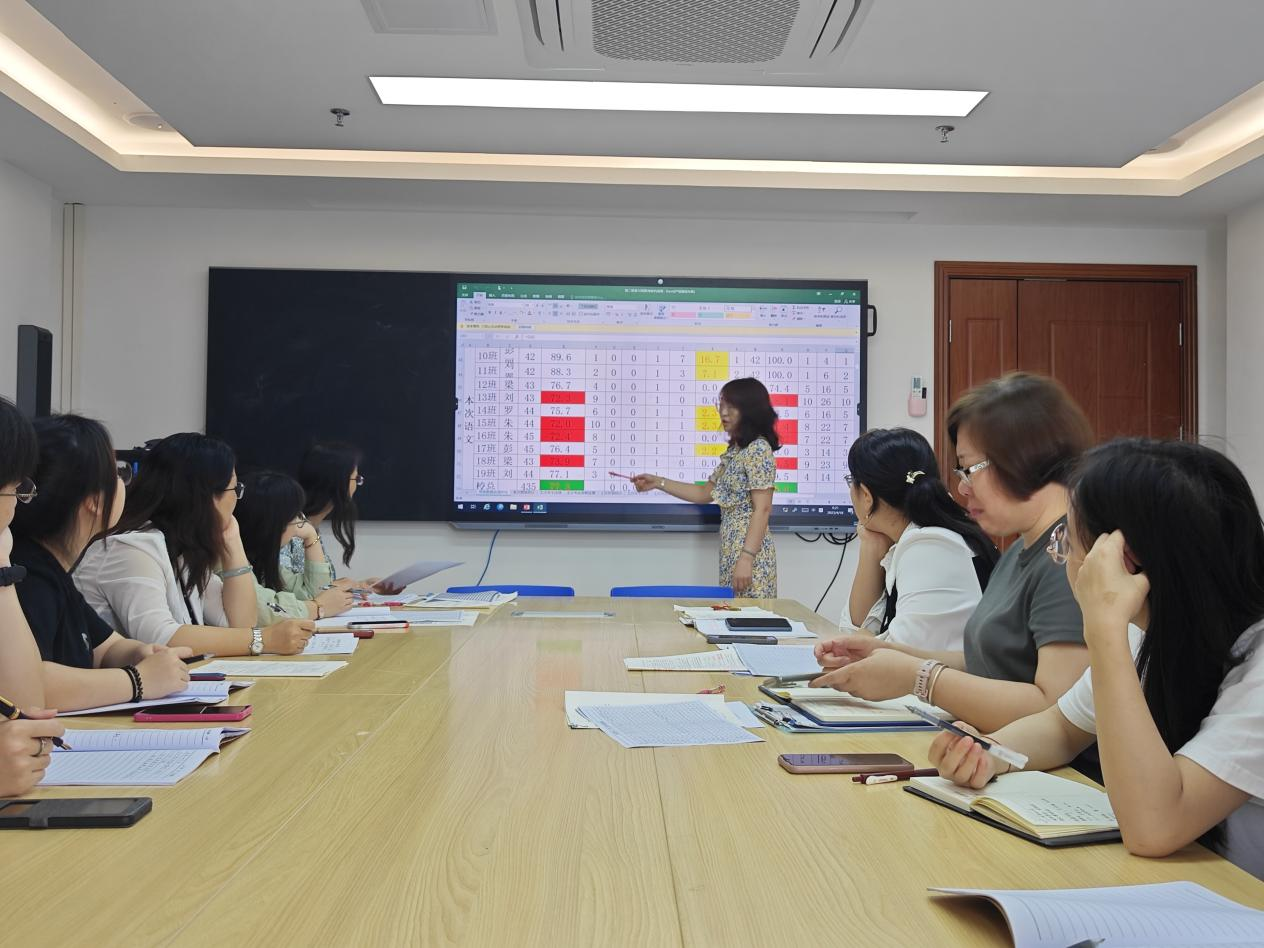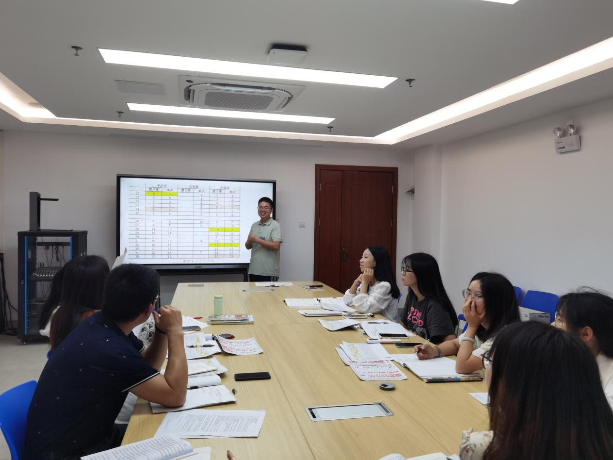 王煦之和彭丽清先从各班平均分入手,对比本学期第八周的考试成绩,分析各班平均分排名的升降情况,实习队队员记录进行成绩分析需要关注的数据。数据分析完成后,王煦之和彭丽清带领全体语文老师分析此次考试试卷,针对具体试题思考接下来的语文教学中需要改进提高的方面。针对古诗文默写题失分较高这一问题,实习队队员陈子豪结合自己背诗、写诗的经验建议道:“学生背诗容易反复背错的原因可能是他们在机械式地背诵,不懂得结合诗歌押韵这一特点来进行背诵。建议在接下来的古诗文教学中,让学生结合诗歌的韵律特点,有规律地背诵诗歌。”这一建议得到了彭丽清的高度肯定,其他实习队员也结合自己的学习经验积极建言献策,会议氛围轻松,实习队员参与感强。
