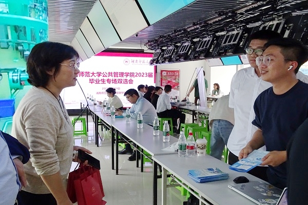 (通讯员 崔蓝心)4月19日下午,公共管理学院(以下简称“公管院”)在桃子湖文化创意产业园A2-5栋举办2023届春季专场双选会。公管院党委书记余望成、孙雯波、2019级辅导员段潇涌到达现场与参会单位和应聘毕业生交谈。