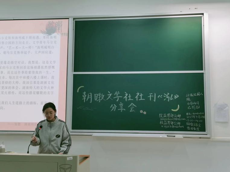 (通讯员 唐清华 谌琬玥 施观李)4月24日中午,文学院朝暾文学社于文渊楼317教室举办朝暾文学社2023年度社刊《泓》分享会。此次分享会由理事胡紫琳主持,共有62名朝暾文学社会员参与。