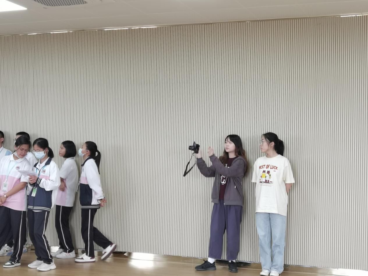 为确保此次班会活动课顺利开展,卢婉莹提前做好活动策划、人员安排、物品归置等准备工作。在卢婉莹和班主任的引导下,学生有序进入舞蹈室,在课室分组进行游戏。实习队队员许晓彤、贾钰彤承担摄影、记录的职责,协助卢婉莹维持现场秩序、推进游戏进度。活动结束后,实习队队员检查舞蹈室的卫生情况,并教导学生团结一心,共同维护校园环境。