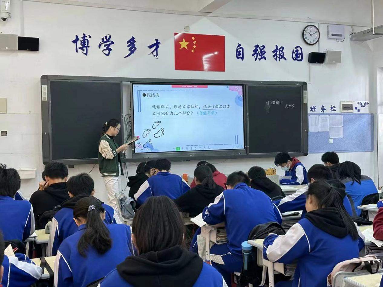 余文琪此次教学课文为《时间的脚印》。她从什么是时间的脚印、有何现实意义及语言赏析三方面入手,带领学生走进这篇科普说明文。她通过设置趣味提问“什么是时间的脚印”,从生活时间到地质时间,生动介绍了岩石记录时间的奇异功能;由文至理,围绕“有何现实意义”这一问题,探明说明逻辑与事理;以“语言赏析”作结,品味生动有趣的语言风格。余文琪通过带领学生们抓关键字句,引导学生层层深入理解文本。