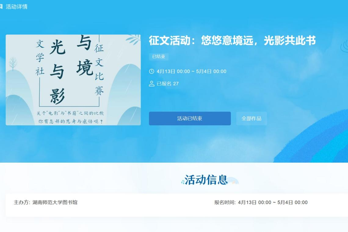 此次征文活动隶属于朝暾文学社“与君初相识,不如从书始”读书节系列活动,活动形式为线上征稿。活动以“电影与书籍的比较”为主题,鼓励同学们对原版书籍及其改编的影视作品进行比较、思考。此次活动采用了全新的投稿渠道,同学们通过进入我校图书馆网页,在首页找到“讲座活动”模块,并点击进入“征文活动:悠悠意境远,光影共此书”板块,即可参与报名投稿。此次活动得到校图书馆支持,共设置一等奖3名,二等奖6名,三等奖12名,优秀奖10名,朝暾文学社将于近日进行评审,并秉持“公平、公正、公开”原则,对获奖名单进行公示。